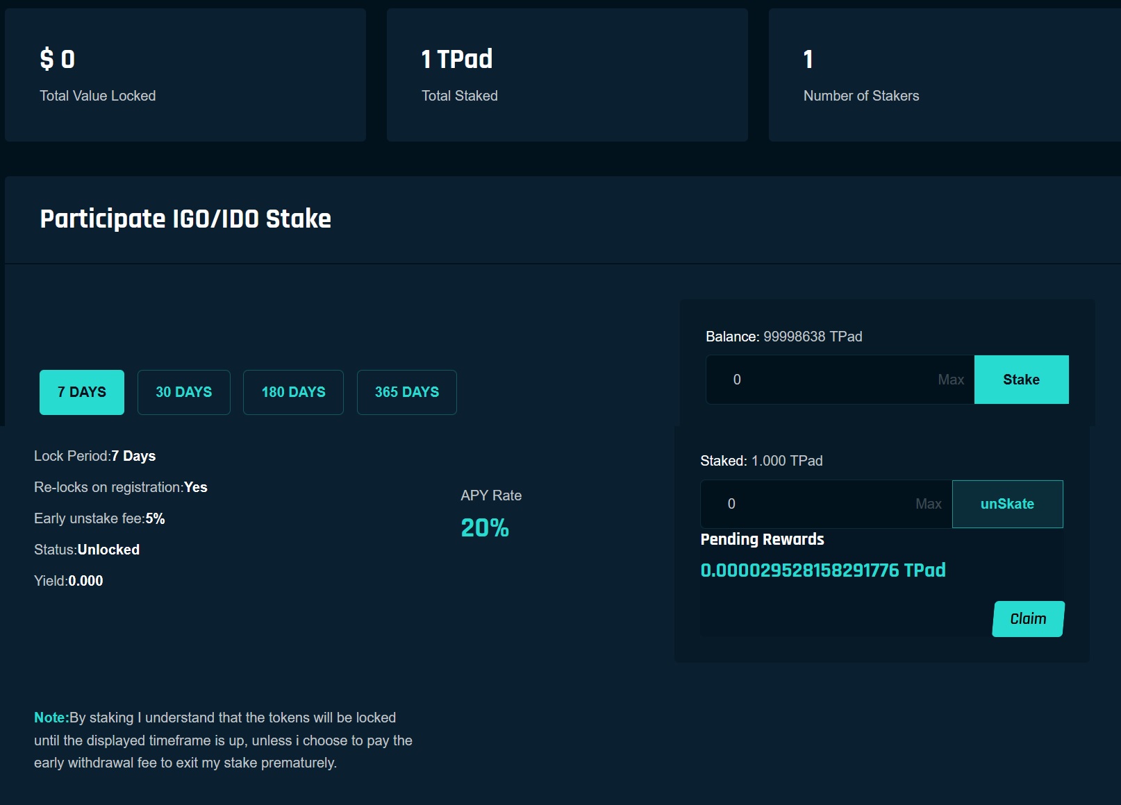 The staking feature consists of the primary and secondary LP pool and allows users to stake their TPAD tokens as well as farm TPAD tokens by adding liquidity into pancakeswap and then staking the LP tokens. The staking feature also serves as a mechanism for the membership tier system.